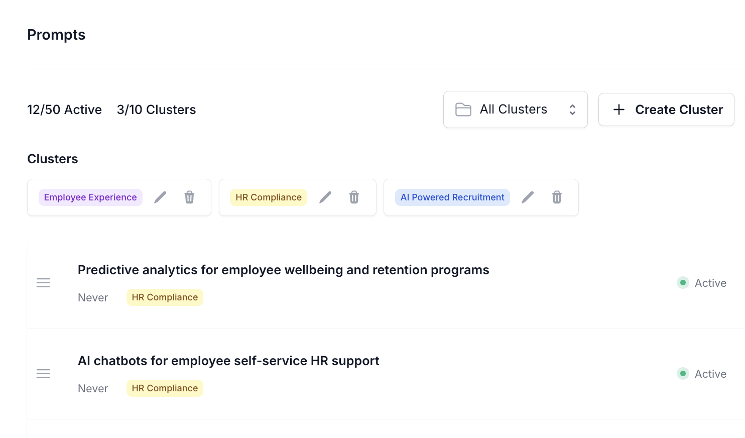 Build out a robust selection of prompts and organize them with advanced segmentation via topic clusters. Filter by clusters to drill down into specific areas of your brand's AI search performance.