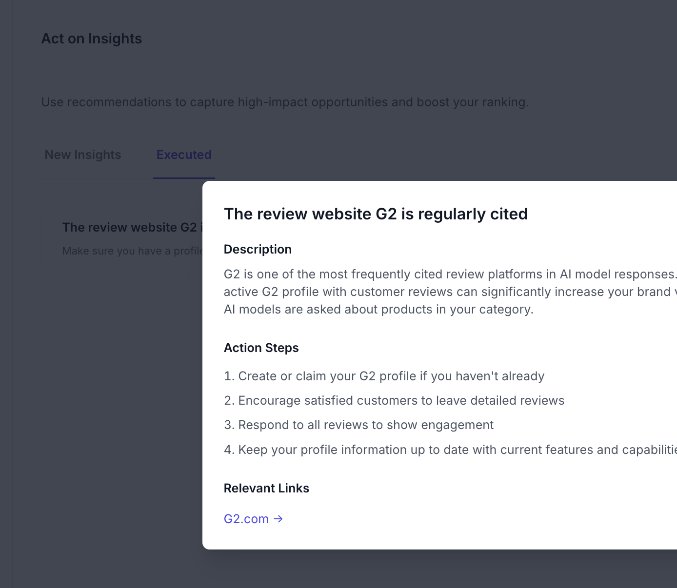 Get high-impact actionable insights tailored to your brand that you can tackle immediately to increase your AI visibility and boost your ranking across AI search platforms.